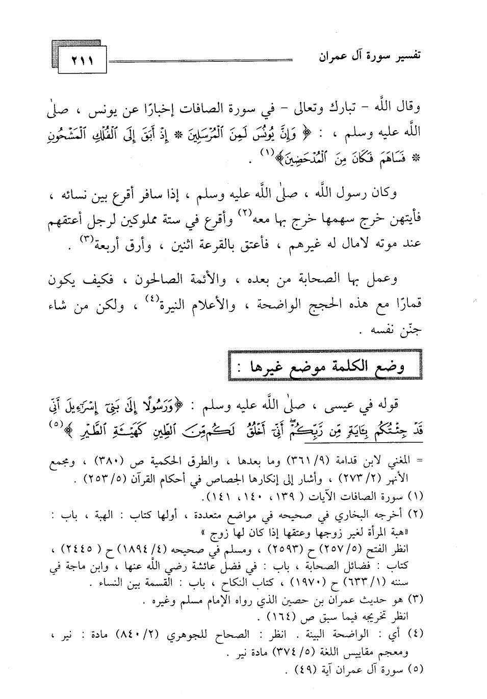 وكان رسول الله - صلى الله عليه وسلم - إذا سافر أقرع بين نسائه، فأيتهن خرج سهمها خرج بها معه وأقرع في ستة مملوكين لرجل أعتقهم عند موته لا مال له غيرهم، فأعتق بالقرعة اثنين، وأرق أربعة. وعمل بها الصحابة من بعده، والأئمة الصالحون، فكيف يكون قمارا مع هذه الحجج الواضحة، والأعلام النيرة، ولكن من شاء جنَّن نفسه.