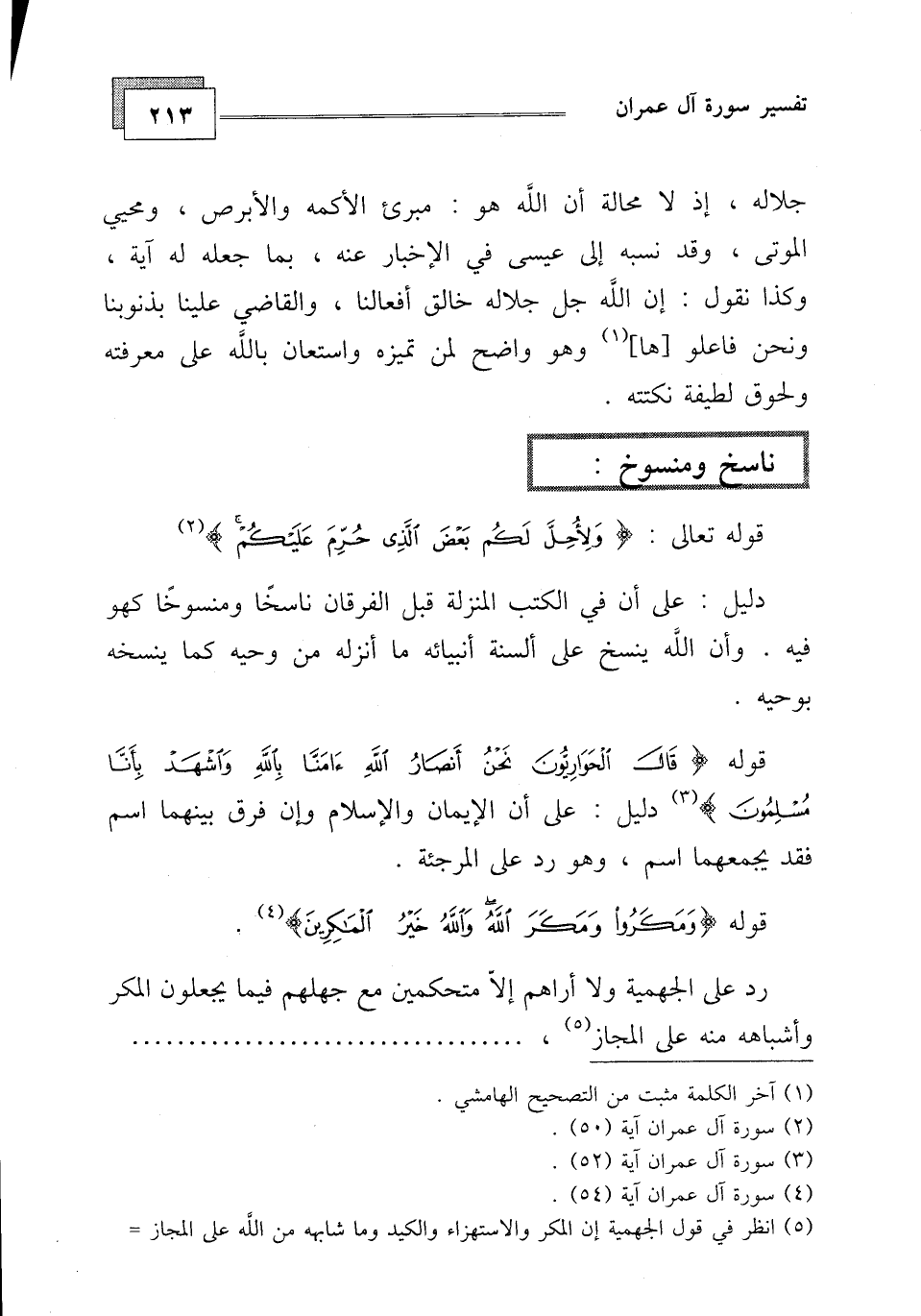 إذ لا محالة أن الله هو: مبرئ الأكمه والأبرص، ومحيي الموتى، وقد نسبه إلى عيسى في الإخبار عنه، بما جعله له آية، وكذا نقول: إن الله جل جلاله خالق أفعالنا، والقاضي علينا بذنوبنا ونحن فاعلين لها، وهو واضح لمن تميزه واستعان بالله على معرفته ولحوق لطيفة نكتته.