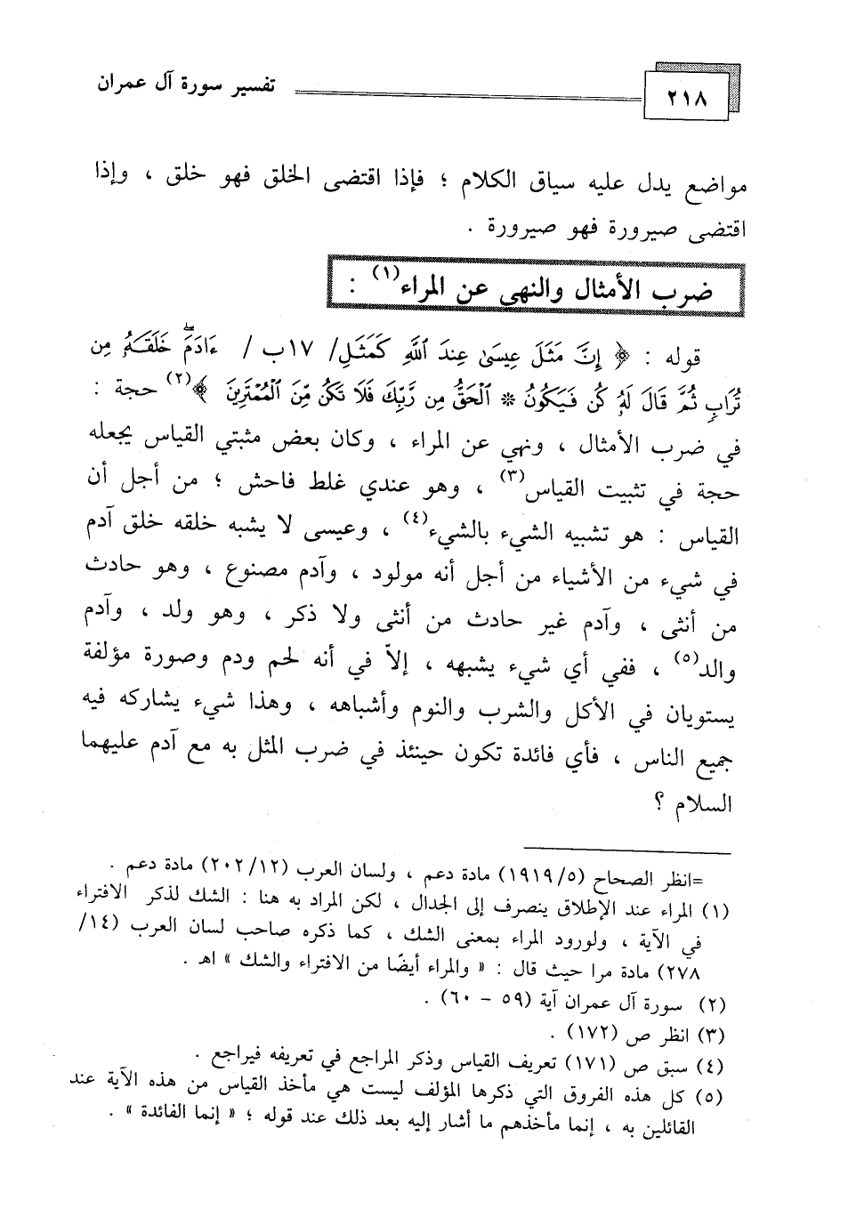 حجة: في ضرب الأمثال، ونهي عن المراء، وكان بعض مثبتي القياس يجعله حجة في تثبيت القياس، وهو عندي غلط فاحش، من أجل أن القياس: هو تشبيه الشيء بالشيء، وعيسى لا يشبه خلقه خلق آدم في شيء من الأشياء من أجل أنه مولود، وآدم مصنوع، وهو حادث من أنثى، وآدم غير حادث من أنثى ولا ذكر، وهو ولد، وآدم والد، ففي أي شيء يشبهه، إلا في أنه لحم ودم وصورة مؤلفة يستويان في الأكل والشرب والنوم وأشباهه، وهذا شيء يشاركه فيه جميع الناس، فأي فائدة تكون حينئذ في ضرب الكل به مع آدم عليهما السلام،