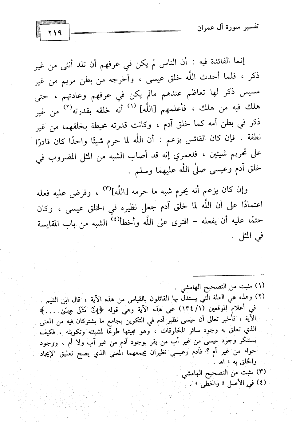 إنما الفائدة فيه: أن الناس لم يكن في عرفهم أن تلد أنثى من غير ذكر، فلما أحدث الله خلق عيسى، وأخرجه من بطن مريم من غير مسيس ذكر لها تعاظم عندهم مالم يكن في عرفهم وعادتهم، حتى هلك فيه من هلك، فأعلمهم الله، أنه خلقه بقدرته من غير ذكر في بطن أمه كما خلق آدم، وكانت قدرته محيطة بخلقهما من غير نطفة. فإن كان القائس يزعم: أن الله لما حرم شيئا واحدا كان قادرا على تحريم شيئين، فلعمري إنه قد أصاب الشبه من المثل المضروب في خلق آدم وعيسى صلى الله عليهما وسلم.