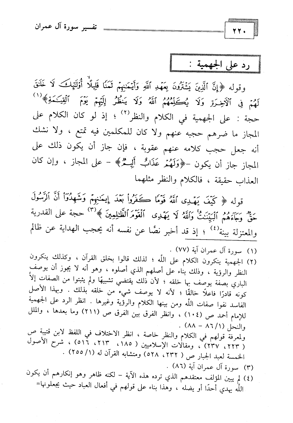 حجة: على الجهمية في الكلام والنظر؛ إذ لو كان الكلام على المجاز ما ضرهم حجبه عنهم ولا كان للمسلمين فيه تمتع، ولا نشك أنه جعل حجب كلامه عنهم عقوبة، فإن جاز أن يكون ذلك على المجاز جاز أن يكون - (وَلَهُمْ عَذَابٌ أَلِيمٌ (77) - على المجاز، وإن كان العذاب حقيقة، فالكلام والنظر مثلهما