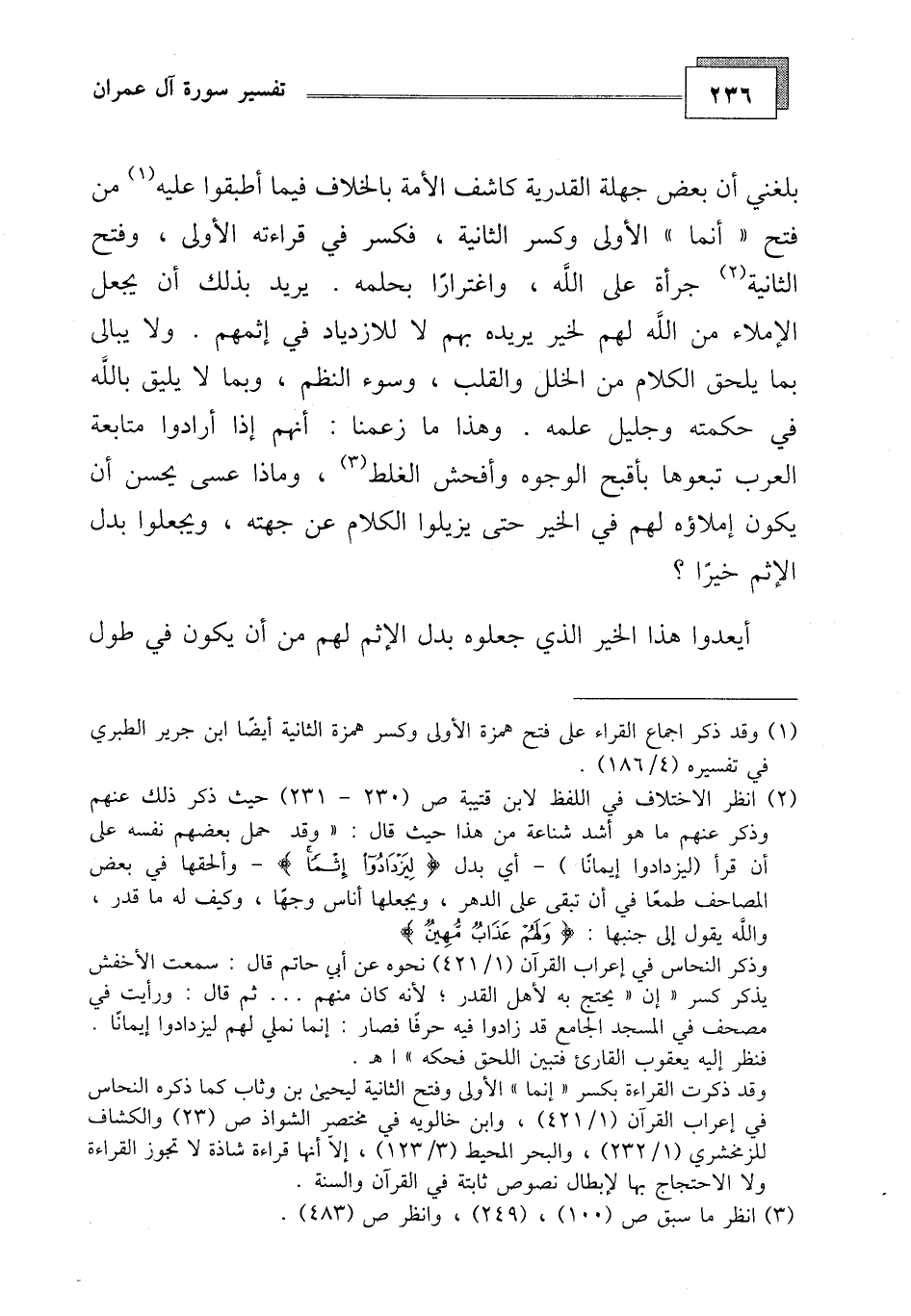 بلغني أن بعض جهلة القدرية كاشف الأمة بالخلاف فيما أطبقوا عليه من فتح " أنما " الأولى وكسر الثانية، فكسر في قراءته الأولى، وفتح الثانية جرأة على الله، واغترارا بحلمه. يريد بذلك أن يحعل الإملاء من الله لهم لخير يريده بهم لا للازدياد في إثمهم. ولا يبالي بما يلحق الكلام من الخلل والقلب، وسوء النظم، وبما لا يليق بالله في حكمته وجليل علمه. وهذا ما زعمنا: أنهم إذا أرادوا متابعة العرب تبعوها بأقبح الوجوه وأفحش الغلط، وماذا عسى يحسن أن يكون إملاؤه لهم في الخير حتى يزيلوا الكلام عن جهته، ويجعلوا بدل الإثم خيرا،