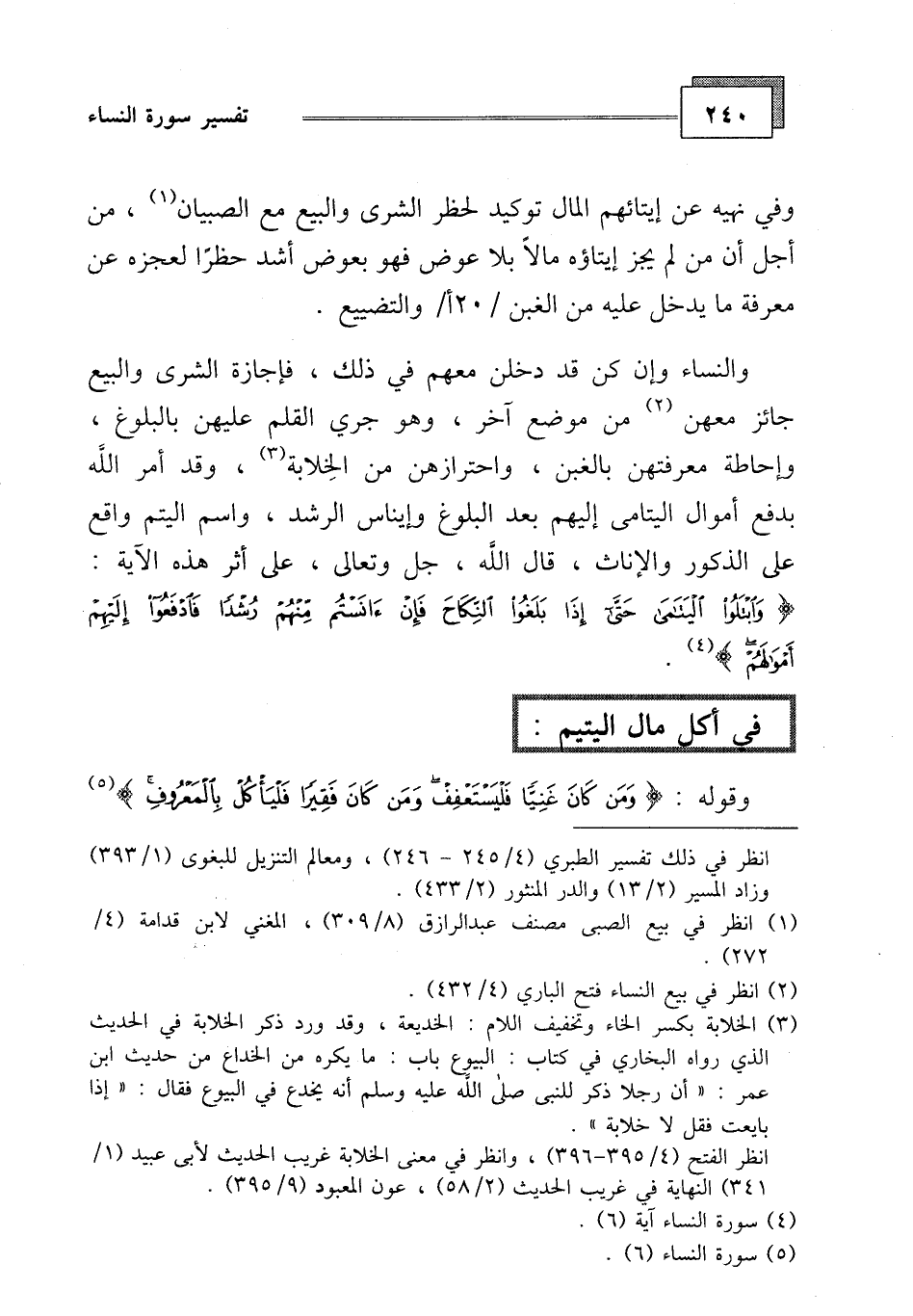 والنساء وإن كن قد دخلن معهم في ذلك، فإجازة الشرى والبيع جائز معهن من موضع آخر، وهو جري القلم عليهن بالبلوغ، وإحاطة معرفتهن بالغبن، واحترازهن من الخلابة، وقد أمر الله بدفع أموال اليتامى إليهم بعد البلوغ وإيناس الرشد، واسم اليتم واقع على الذكور والإناث، قال الله، جل وتعالى، على أثر هذه الآية: (وَابْتَلُوا الْيَتَامَى حَتَّى إِذَا بَلَغُوا النِّكَاحَ فَإِنْ آنَسْتُمْ مِنْهُمْ رُشْدًا فَادْفَعُوا إِلَيْهِمْ أَمْوَالَهُمْ)