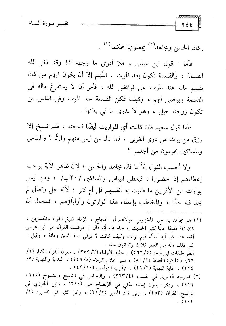 فأما قول سعيد فإن كانت آي المواريث أينما نسخته، فلم تنسخ إلا رزق من يرث من ذوى القربى، فما بال من ليس منهم وارثا، واليتامى والمساكين يحرمون من أجلهم،