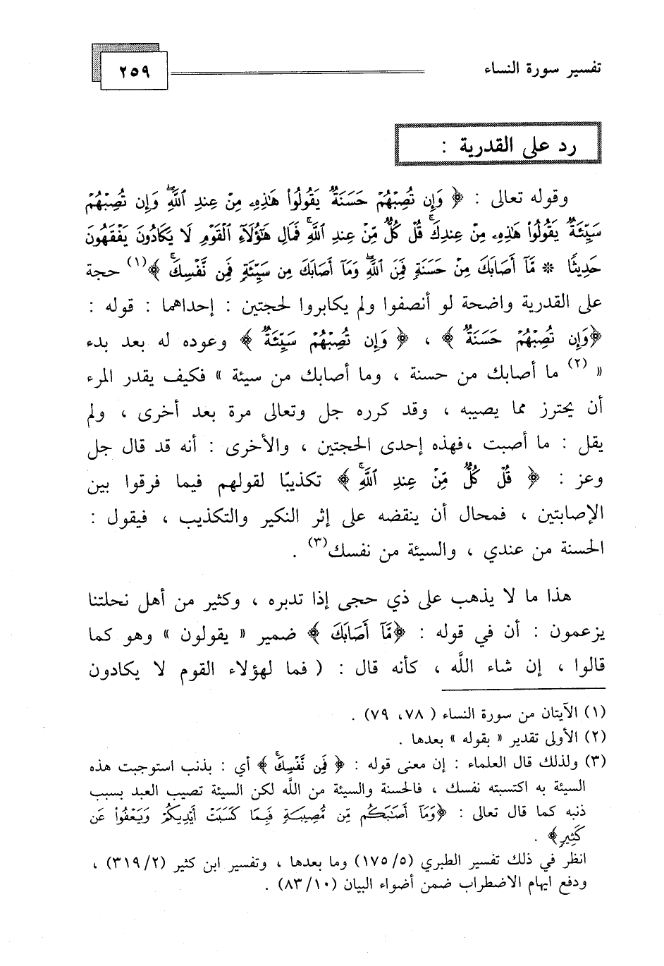 وقوله تعالى: (وَإِنْ تُصِبْهُمْ حَسَنَةٌ يَقُولُوا هَذِهِ مِنْ عِنْدِ اللَّهِ وَإِنْ تُصِبْهُمْ سَيِّئَةٌ يَقُولُوا هَذِهِ مِنْ عِنْدِكَ قُلْ كُلٌّ مِنْ عِنْدِ اللَّهِ فَمَالِ هَؤُلَاءِ الْقَوْمِ لَا يَكَادُونَ يَفْقَهُونَ حَدِيثًا (78) مَا أَصَابَكَ مِنْ حَسَنَةٍ فَمِنَ اللَّهِ وَمَا أَصَابَكَ مِنْ سَيِّئَةٍ فَمِنْ نَفْسِكَ)