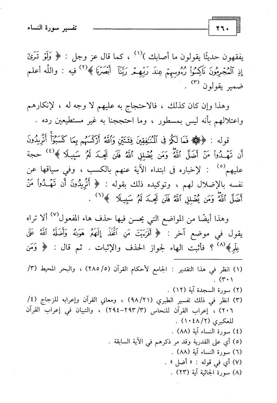 قوله: (فَمَا لَكُمْ فِي الْمُنَافِقِينَ فِئَتَيْنِ وَاللَّهُ أَرْكَسَهُمْ بِمَا كَسَبُوا أَتُرِيدُونَ أَنْ تَهْدُوا مَنْ أَضَلَّ اللَّهُ وَمَنْ يُضْلِلِ اللَّهُ فَلَنْ تَجِدَ لَهُ سَبِيلًا (88)