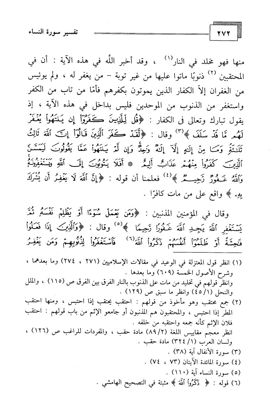 وقال في المؤمنين المذنبين: (وَمَنْ يَعْمَلْ سُوءًا أَوْ يَظْلِمْ نَفْسَهُ ثُمَّ يَسْتَغْفِرِ اللَّهَ يَجِدِ اللَّهَ غَفُورًا رَحِيمًا (110)