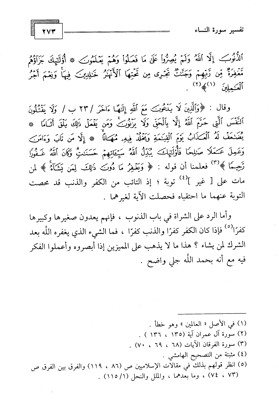 وأما الرد على الشراة في باب الذنوب، فإنهم يعدون صغيرها وكبيرها كفرا فإذا كان الكفر كفرا والذنب كفرا، فما الشيء الذي يغفره الله بعد الشرك لمن يشاء،