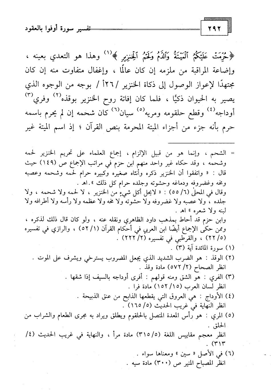وهذا هو التعدي بعينه، وإضاعة المراقبة من ملزمه إن كان عالما، وإغفال متفاوت منه إن كان مجتهدا لإعواز الوصول إلى زكاة الخنزير بوجه من الوجوه الذي يصير به الحيوان ذكيا، فلما كان إفاتة روح الخنزير بوقذه وفري أوداجه وقطع حلقومه ومريه سيان كان شحمه إن لم يحرم باسمه حرم بأنه جزء من أجزاء الميتة المحرمة بنص القرآن، إذ اسم الميتة غير
