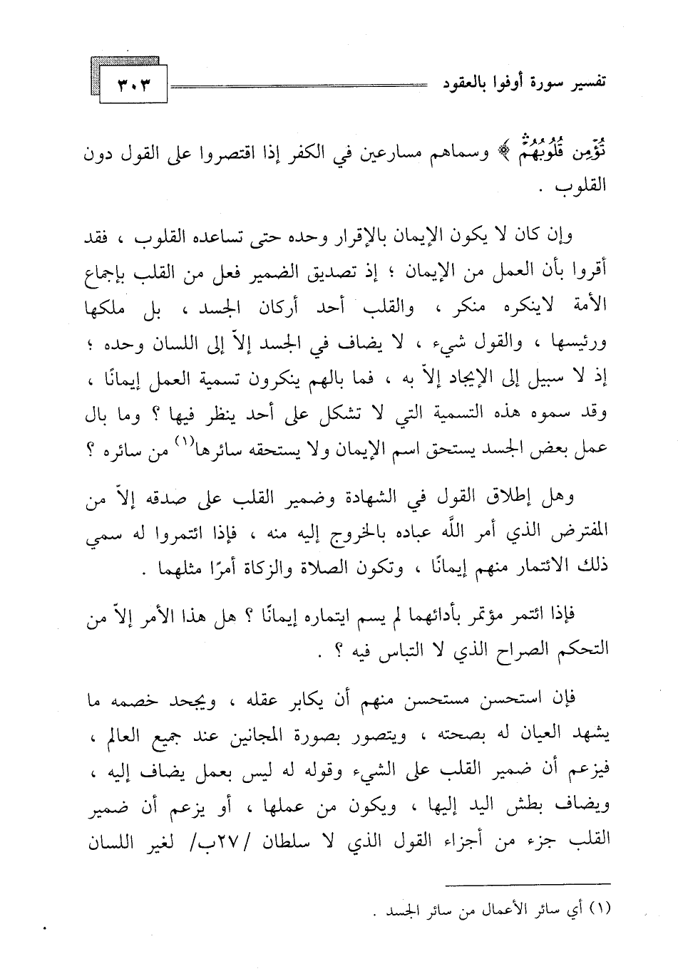 وإن كان لا يكون الإيمان بالإقرار وحده حتى تساعده القلوب، فقد أقروا بأن العمل من الإيمان، إذ تصديق الضمير فعل من القلب بإجماع الأمة لا ينكره منكر، والقلب أحد أركان الجسد، بل ملكها ورئيسها، والقول شيء، لا يضاف في الجسد إلا إلى اللسان وحده، إذ لا سبيل إلى الإيجاد إلا به، فما بالهم ينكرون تسمية العمل إيمانا، وقد سموه هذه التسمية التي لا تشكل على أحد ينظر فيها، وما بال عمل بعض الجسد يستحق اسم الإيمان ولا يستحقه سائرها من سائره، وهل إطلاق القول في الشهادة وضمير القلب على صدقه إلا من المفترض الذي أمر الله عباده بالخروج إليه منه، فإذا ائتمروا له سمي ذلك الائتمار منهم إيمانا، وتكون الصلاة والزكاة أمرا مثلهما.