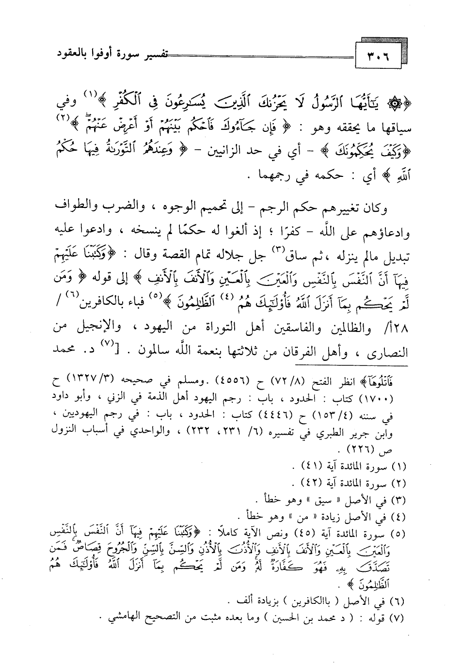 وكان تغييرهم حكم الرجم - إلى تحميم الوجوه، والضرب والطواف وادعاؤهم على الله - كفرا، إذ ألغوا له حكما لم ينسخه، وادعوا عليه تبديل مالم ينزله، ثم ساق جل جلاله تمام القصة وقال: (وَكَتَبْنَا عَلَيْهِمْ فِيهَا أَنَّ النَّفْسَ بِالنَّفْسِ وَالْعَيْنَ بِالْعَيْنِ وَالْأَنْفَ بِالْأَنْفِ وَالْأُذُنَ بِالْأُذُنِ وَالسِّنَّ بِالسِّنِّ وَالْجُرُوحَ قِصَاصٌ فَمَنْ تَصَدَّقَ بِهِ فَهُوَ كَفَّارَةٌ لَهُ وَمَنْ لَمْ يَحْكُمْ بِمَا أَنْزَلَ اللَّهُ فَأُولَئِكَ هُمُ الظَّالِمُونَ (45)