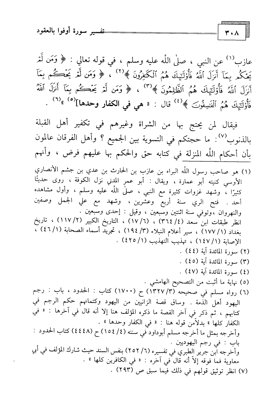 عازب عن النبي - صلى الله عليه وسلم - في قوله تعالي:وَمَنْ لَمْ يَحْكُمْ بِمَا أَنْزَلَ اللَّهُ فَأُولَئِكَ هُمُ الْكَافِرُونَ (44) ،