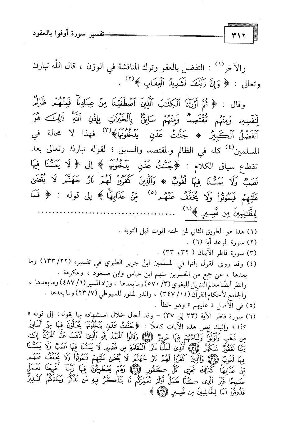 فهذا لا محالة في المسلمين كله في الظالم والقاصد والسابق، لقوله تبارك وتعالى بعد انقطاع سياق الكلام: (جَنَّاتُ عَدْنٍ يَدْخُلُونَهَا يُحَلَّوْنَ فِيهَا مِنْ أَسَاوِرَ مِنْ ذَهَبٍ وَلُؤْلُؤًا وَلِبَاسُهُمْ فِيهَا حَرِيرٌ (33) وَقَالُوا الْحَمْدُ لِلَّهِ الَّذِي أَذْهَبَ عَنَّا الْحَزَنَ إِنَّ رَبَّنَا لَغَفُورٌ شَكُورٌ (34) الَّذِي أَحَلَّنَا دَارَ الْمُقَامَةِ مِنْ فَضْلِهِ لَا يَمَسُّنَا فِيهَا نَصَبٌ وَلَا يَمَسُّنَا فِيهَا لُغُوبٌ (35) وَالَّذِينَ كَفَرُوا لَهُمْ نَارُ جَهَنَّمَ لَا يُقْضَى عَلَيْهِمْ فَيَمُوتُوا وَلَا يُخَفَّفُ عَنْهُمْ مِنْ عَذَابِهَا كَذَلِكَ نَجْزِي كُلَّ كَفُورٍ (36) وَهُمْ يَصْطَرِخُونَ فِيهَا رَبَّنَا أَخْرِجْنَا نَعْمَلْ صَالِحًا غَيْرَ الَّذِي كُنَّا نَعْمَلُ أَوَلَمْ نُعَمِّرْكُمْ مَا يَتَذَكَّرُ فِيهِ مَنْ تَذَكَّرَ وَجَاءَكُمُ النَّذِيرُ فَذُوقُوا فَمَا لِلظَّالِمِينَ مِنْ نَصِيرٍ (37)
