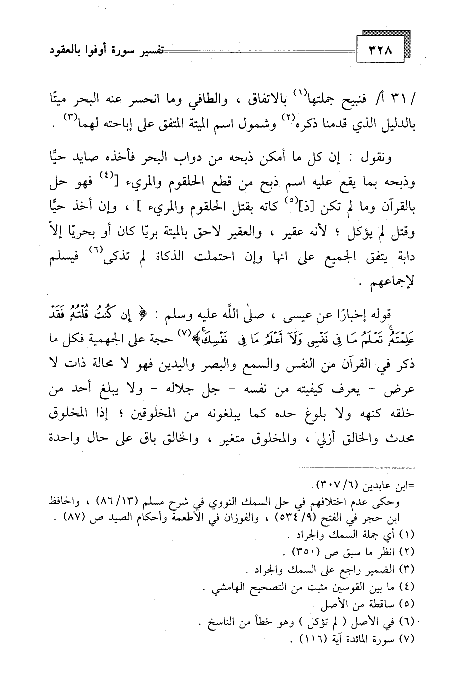 ونقول: إن كل ما أمكن ذبحه من دواب البحر فأخذه صايد حيا وذبحه بما يقع عليه اسم ذبح من قطع الحلقوم والمريء فهو حل بالقرآن وما لم تكن ذكاته بقتل الحلقوم والمريء،، وإن أخذ حيا وقتل لم يؤكل، لأنه عقير، والعقير لاحق بالميتة بريا كان أو بحريا إلا دابة يتفق الجميع على أنها وإن احتملت الذكية لم تذكي فيسلم لإجماعهم.