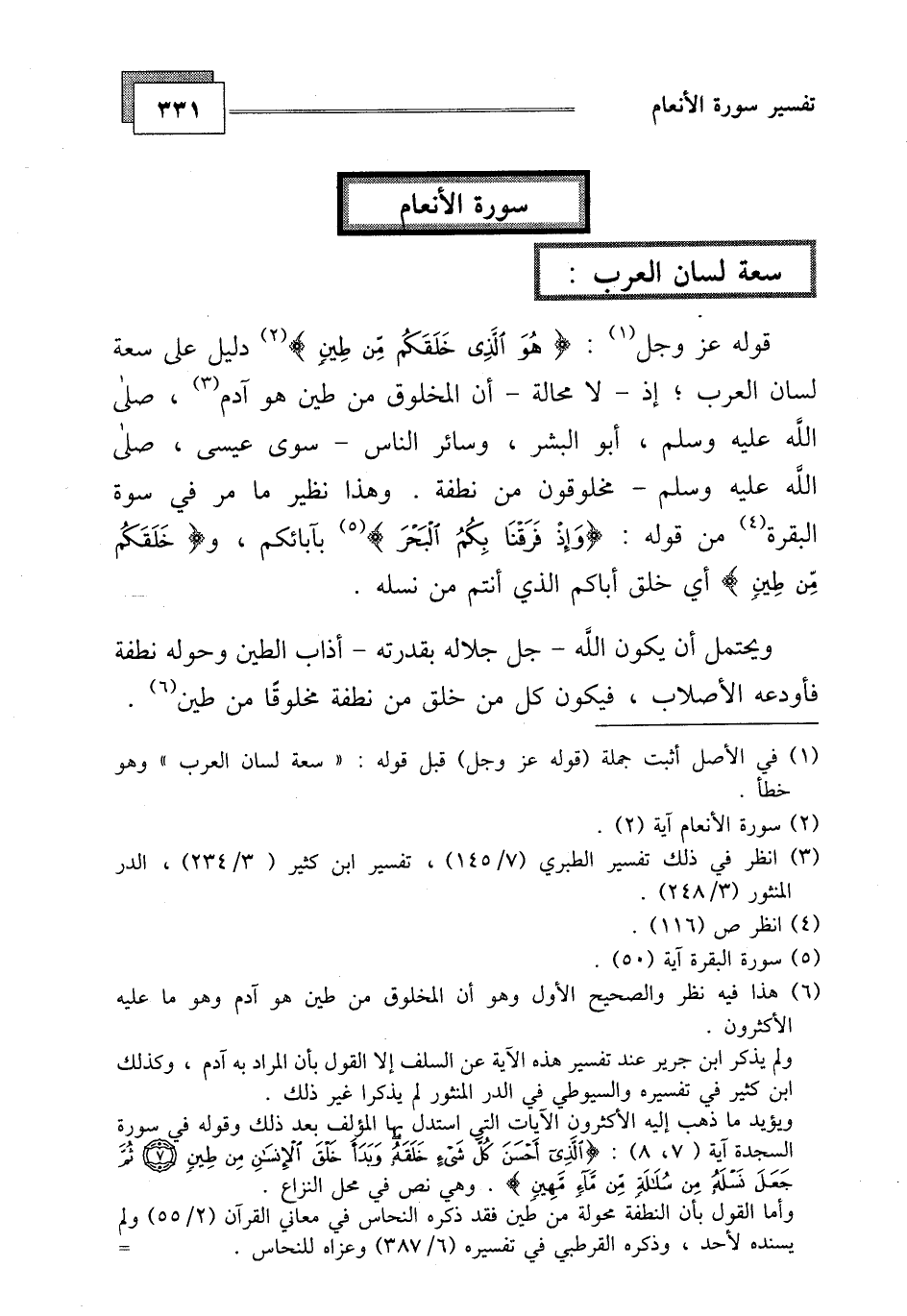 دليل على سعة لسان العرب، إذ - لا محالة - أن المخلوق من طين هو آدم، صلى الله عليه وسلم، أبو البشر، وسائر الناس - سوى عيسى - صلى الله عليه وسلم - مخلوقون من نطفة. وهذا نظير ما مر في سور البقرة من قوله: (وَإِذْ فَرَقْنَا بِكُمُ الْبَحْرَ) بآبائكم، (خَلَقَكُمْ مِنْ طِينٍ) أي خلق أباكم الذي أنتم من نسله.