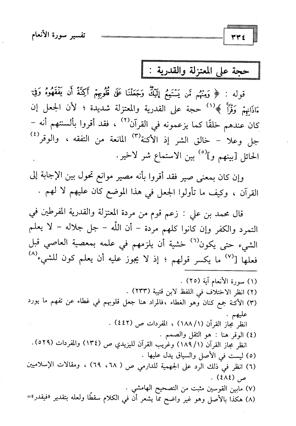 حجة على القدرية والمعتزلة شديدة، لأن الجعل إن كان عندهم خلقا كما يزعمونه في القرآن، فقد أقروا بألسنتهم أنه - جل وعلا - خالق الشر إذ الأكنة المانعة من التفقه، والوقر الحائل أبينهم وبين الاستماع شر لا خير.