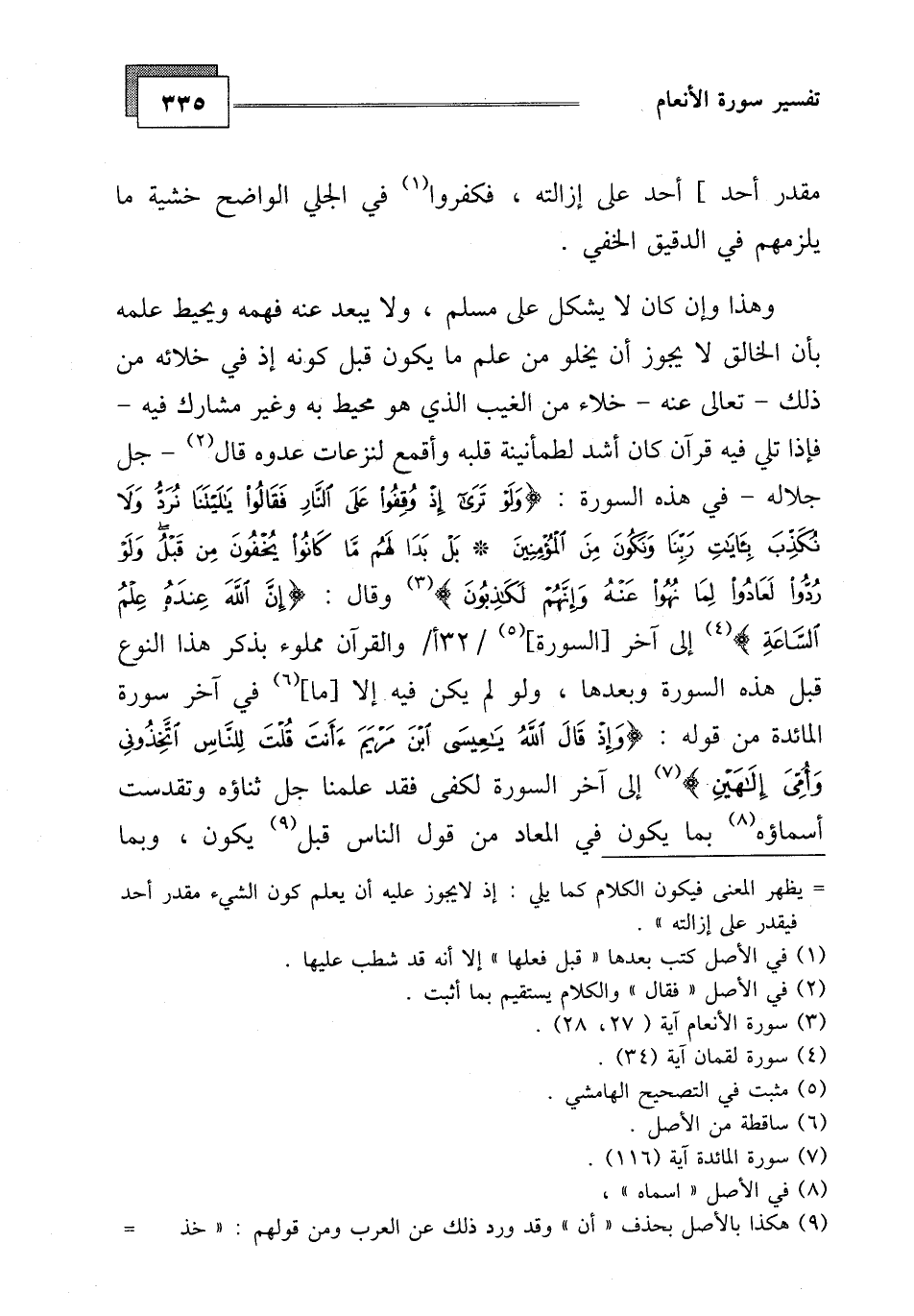 بأن الخالق لا يجوز أن يخلو من علم ما يكون قبل كونه إذ في خلائه من ذلك - تعالى عنه - خلاء من الغيب الذي هو محيط به وغير مشارك فيه - فإذا تلي فيه قرآن كان أشد لطمأنينة قلبه وأقمع لنزعات عدوه قال - جل جلاله - في هذه السورة: (وَلَوْ تَرَى إِذْ وُقِفُوا عَلَى النَّارِ فَقَالُوا يَا لَيْتَنَا نُرَدُّ وَلَا نُكَذِّبَ بِآيَاتِ رَبِّنَا وَنَكُونَ مِنَ الْمُؤْمِنِينَ (27) بَلْ بَدَا لَهُمْ مَا كَانُوا يُخْفُونَ مِنْ قَبْلُ وَلَوْ رُدُّوا لَعَادُوا لِمَا نُهُوا عَنْهُ وَإِنَّهُمْ لَكَاذِبُونَ (28)
