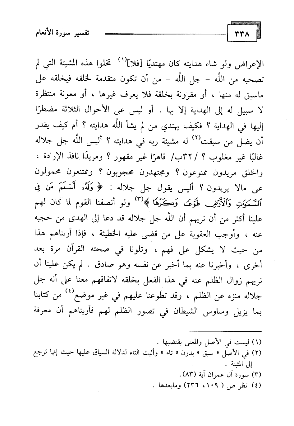 الإعراض ولو شاء هدايته كان مبتدئا فلا تخلوا هذه المشيئة التي لم تصحبه من الله - جل الله - من أن تكون متقدمة لخلقه فيخلقه على ما سبق له منها، أو مقرونة بخلقة فلا يعرف غيرها، أو معونة منتظرة لا سبيل له إلى الهداية إلا بها. أو ليس على الأحوال الثلاثة مضطرا إليها في الهداية، فكيف يهتدي من لم يشأ الله هدايته، أم كيف يقدر أن يضل من سبقت له مشيئة ربه في هدايته، أليس الله جل جلاله غالبا غير مغلوب قاهرا غير مقهور، ومريدا نافذ الإرادة، والخلق مريدون ممنوعون، ومجتهدون محجوبون، وممتنعون محمولون على ما لا يريدون، أليس يقول جل جلاله: (وَلَهُ أَسْلَمَ مَنْ فِي السَّمَاوَاتِ وَالْأَرْضِ طَوْعًا وَكَرْهًا)