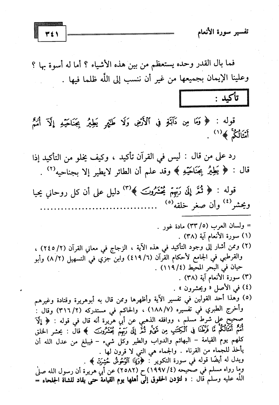 قوله: (وَمَا مِنْ دَابَّةٍ فِي الْأَرْضِ وَلَا طَائِرٍ يَطِيرُ بِجَنَاحَيْهِ إِلَّا أُمَمٌ أَمْثَالُكُمْ) .