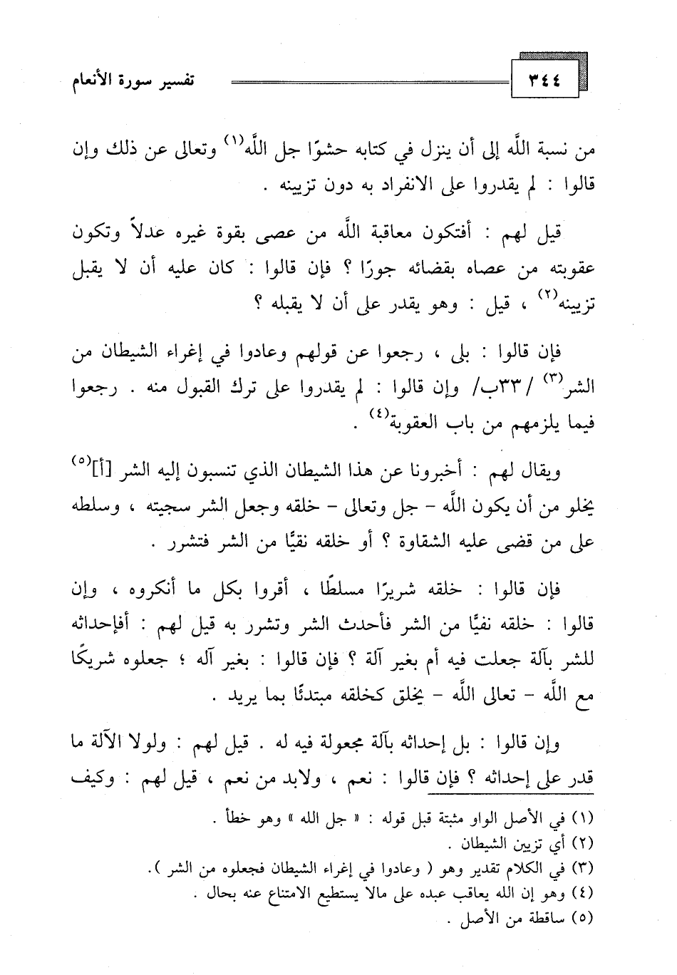 ويقال لهم: أخبرونا عن هذا الشيطان الذي تنسبون إليه الشر أيخلو من أن يكون الله - جل وتعالى - خلقه وجعل الشر سجيته، وسلطه على من قضى عليه الشقاوة، أو خلقه نقيا من الشر فتشرر.