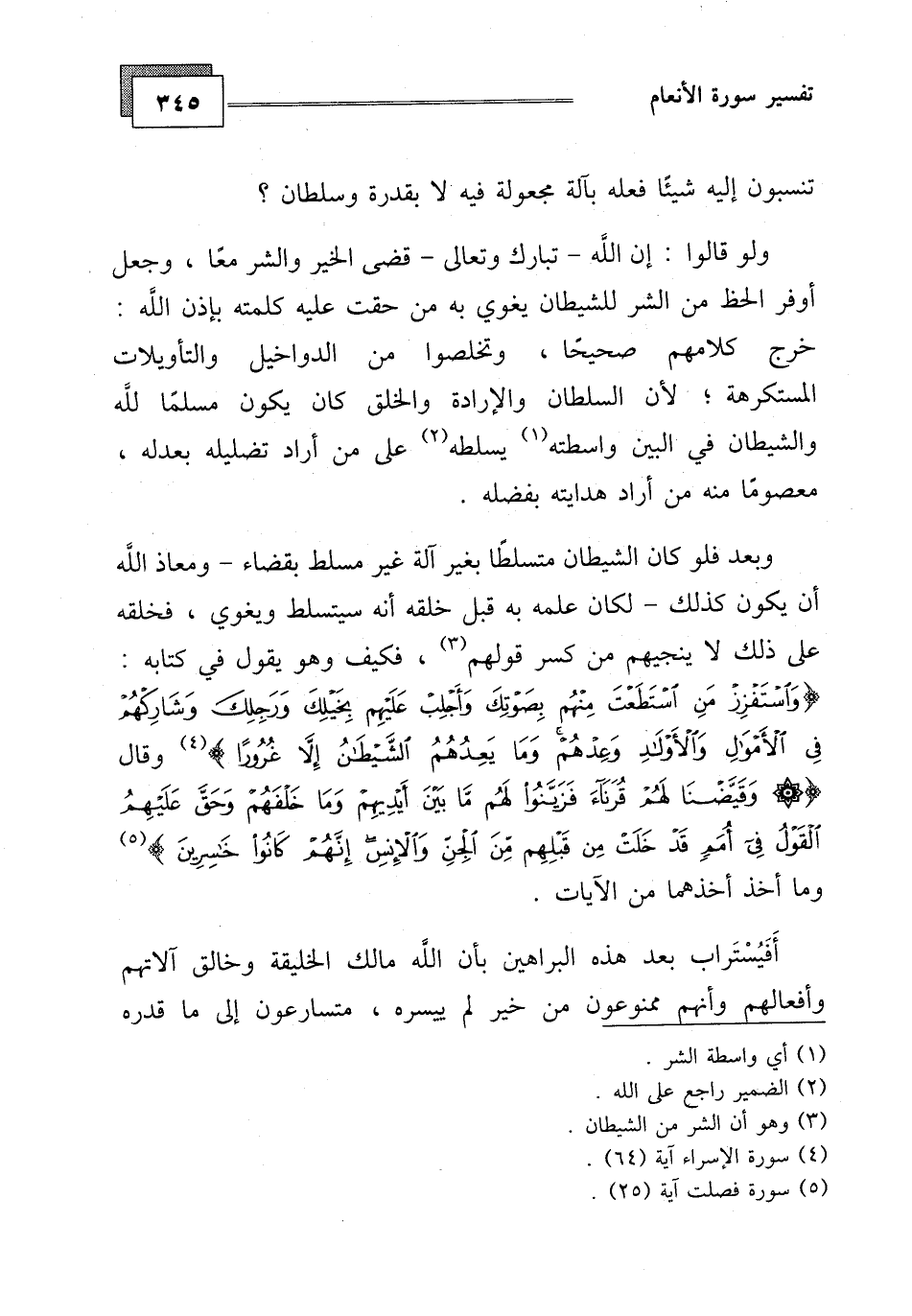 أن يكون كذلك - لكان علمه به قبل خلقه أنه سيتسلط ويغوي، فخلقه على ذلك لا ينجيهم من كسر قولهم، فكيف وهو يقوله في كتابه: (وَاسْتَفْزِزْ مَنِ اسْتَطَعْتَ مِنْهُمْ بِصَوْتِكَ وَأَجْلِبْ عَلَيْهِمْ بِخَيْلِكَ وَرَجِلِكَ وَشَارِكْهُمْ فِي الْأَمْوَالِ وَالْأَوْلَادِ وَعِدْهُمْ وَمَا يَعِدُهُمُ الشَّيْطَانُ إِلَّا غُرُورًا (64)