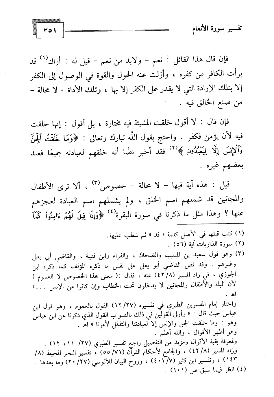 فإن قال هذا القائل: نعم - ولابد من نعم - قيل له: أراك قد برأت الكافر من كفره، وأزلت عنه الحول والقوة في الوصول إلى الكفر إلا بتلك الإرادة التي لا يقدر على الكفر إلا بها، وتلك الأداة - لا محالة - من صنع الخالق فيه.