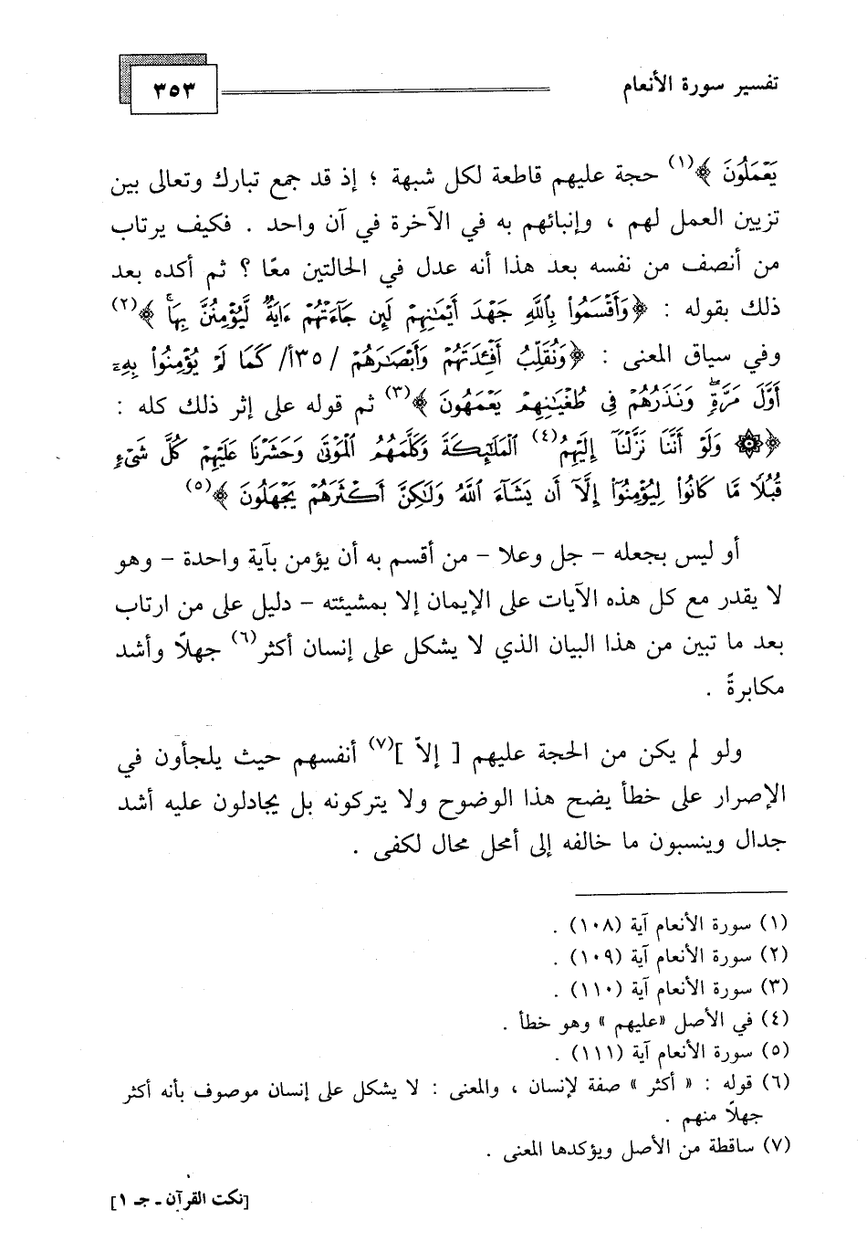ثم قوله على إثر ذلك كله: (وَلَوْ أَنَّنَا نَزَّلْنَا إِلَيْهِمُ الْمَلَائِكَةَ وَكَلَّمَهُمُ الْمَوْتَى وَحَشَرْنَا عَلَيْهِمْ كُلَّ شَيْءٍ قُبُلًا مَا كَانُوا لِيُؤْمِنُوا إِلَّا أَنْ يَشَاءَ اللَّهُ وَلَكِنَّ أَكْثَرَهُمْ يَجْهَلُونَ (111)