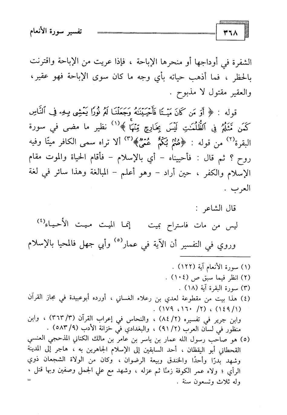 قوله: (أَوَمَنْ كَانَ مَيْتًا فَأَحْيَيْنَاهُ وَجَعَلْنَا لَهُ نُورًا يَمْشِي بِهِ فِي النَّاسِ كَمَنْ مَثَلُهُ فِي الظُّلُمَاتِ لَيْسَ بِخَارِجٍ مِنْهَا)