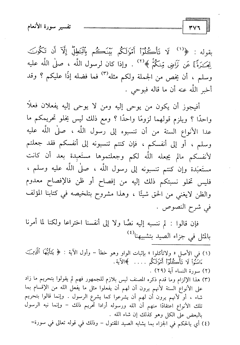 أفيجوز أن يكون من يوحى إليه ومن لا يوحى إليه يفعلان فعلا واحدا، ويلزم قولهما لزوما واحدا، ومع ذلك ليس يخلو تحريمكم ما عدا الأصول الستة من أن تنسبوه إلى رسول الله، صلى الله عليه وسلم، أو إلى أنفسكم، فإن كنتم تنسبونه إلى أنفسكم فقد جعلتم لأنفسكم مالم يجعله الله لكم وجعلتموها مستعبِدة بعد أن كانت مستعبَدة وإن كنتم تنسبونه إلى رسول الله، صلى الله عليه وسلم، فليس تخلو نسبتكم ذلك إليه من إفصاح أو ظن فالإفصاح معدوم والظن لا يغني من الحق شيئا، وهذا مشروح بتلخيصه في كتابنا المؤلف في شرح النصوص.