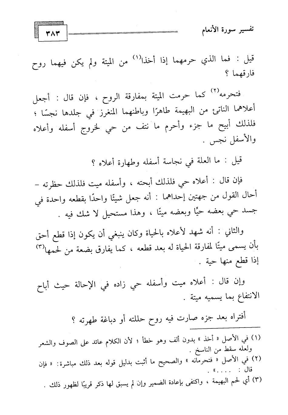 فإن قال: أعلاه حي فلذلك أبحته، وأسفله ميت فلذلك حظرته - أحال القول من جهتين إحداهما: أنه جعل شيئا واحدا بقطعه واحدة في جسد حي بعضه حيا وبعضه شيئا، وهذا مستحيل لا شك فيه.