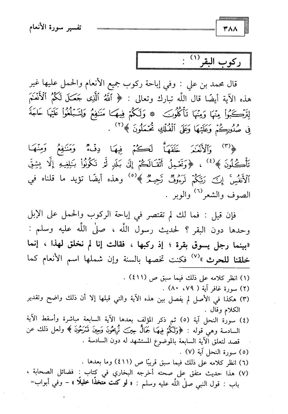قال محمد بن علي: وفي إباحة ركوب جميع الأنعام والحمل عليها غير هذه الآية أيضا قال الله تبارك وتعالى: (اللَّهُ الَّذِي جَعَلَ لَكُمُ الْأَنْعَامَ لِتَرْكَبُوا مِنْهَا وَمِنْهَا تَأْكُلُونَ (79) وَلَكُمْ فِيهَا مَنَافِعُ وَلِتَبْلُغُوا عَلَيْهَا حَاجَةً فِي صُدُورِكُمْ وَعَلَيْهَا وَعَلَى الْفُلْكِ تُحْمَلُونَ (80) .