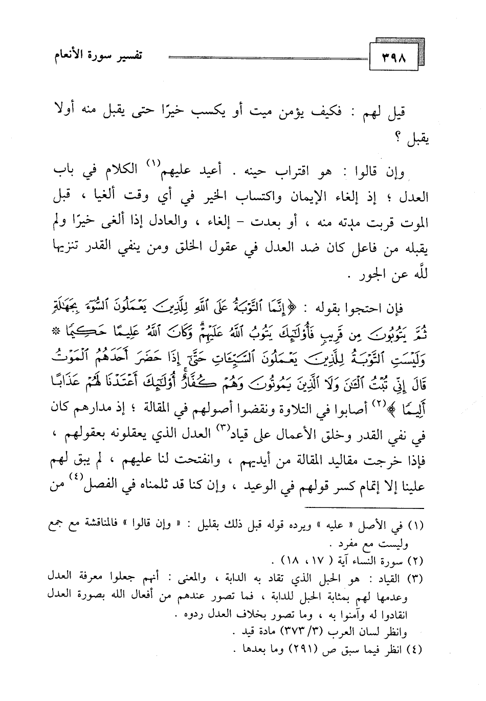 وإن قالوا: هو اقتراب حينه. أعيد عليهم الكلام في باب العدل، إذ إلغاء الإيمان واكتساب الخير في أي وقت ألغيا، قبل الموت قربت مدته منه، أو بعدت - إلغاء، والعادل إذا ألغى خيرا ولم يقبله من فاعل كان ضد العدل في عقول الخلق ومن ينفي القدر تنزيها لله عن الجور.