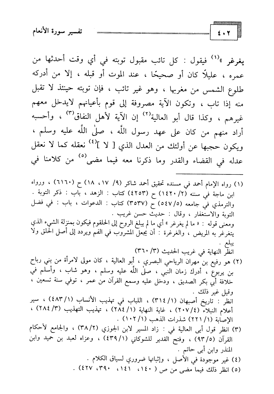 فيقول: كل تائب مقبول توبته في أي وقت أحدثها من عمره، عليلا كان أو صحيحا، عند الموت أو قبله، إلا من أدركه طلوع الشمس من مغربها، وهو غير تائب، فإن توبته حينئذ لا تقبل منه إذا تاب، وتكون الآية مصروفة إلى قوم بأعيانهم لا تدخل معهم غيرهم، وكذا قال أبو العالية إن الآية لأهل النفاق، وأحسبه أراد منهم من كان على عهد رسول الله، صلى الله عليه وسلم، ويكون حجبها عن أولئك من العدل الذي لا نعقله كما لا نعقل عدله في القضاء والقدر وما ذكرنا معه فيما مضى من كلامنا في