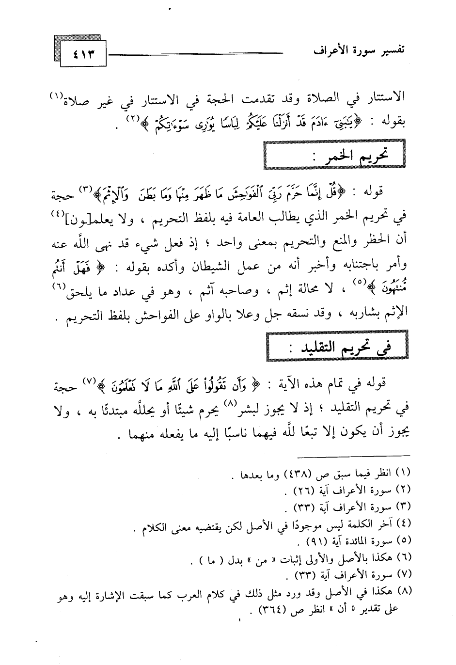حجة في تحريم الخمر الذي يطالب العامة فيه بلفظ التحريم، ولا يعلمون، أن الحظر والمنع والتحريم بمعنى واحد؛ إذ فعل شيء قد نهى الله عنه وأمر باجتنابه وأخبر أنه من عمل الشيطان وأكده بقوله: (فَهَلْ أَنْتُمْ مُنْتَهُونَ (91) ، لا محالة إثم، وصاحبه آثم، وهو في عداد ما يلحق الإثم بشاربه، وقد نسقه جل وعلا بالواو على الفواحش بلفظ التحريم.