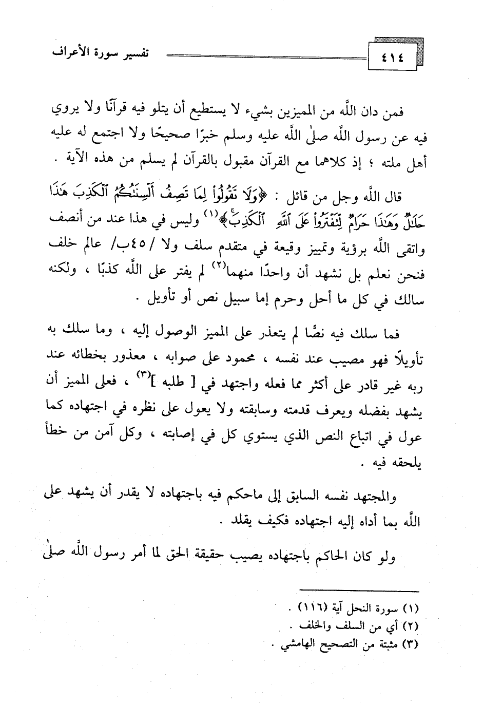 فيه عن رسول الله - صلى الله عليه وسلم - خبرا صحيحا ولا اجتمع له عليه أهل ملته، إذ كلاهما مع القرآن مقبول بالقرآن لم يسلم من هنا الآية. قال الله وجل من قائل: (وَلَا تَقُولُوا لِمَا تَصِفُ أَلْسِنَتُكُمُ الْكَذِبَ هَذَا حَلَالٌ وَهَذَا حَرَامٌ لِتَفْتَرُوا عَلَى اللَّهِ الْكَذِبَ)