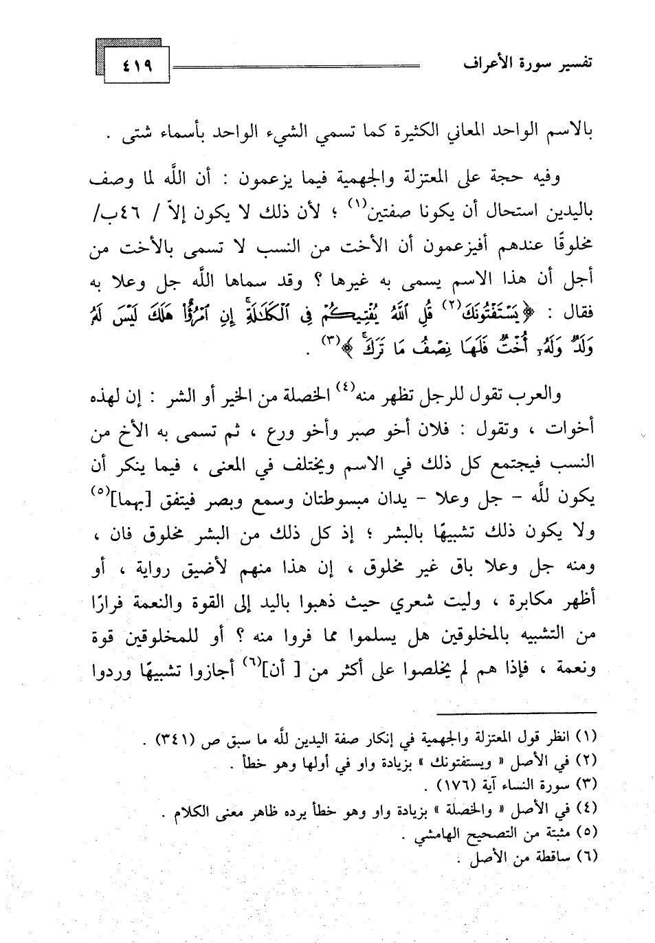 والعرب تقول للرجل تظهر منه الخصلة من الخير أو الشر: إن لهذه أخوات، وتقول: فلان أخو صبر وأخو ورع، ثم تسمى به الأخ من النسب فيجتمع كل ذلك في الاسم ويختلف في المعنى، فيما ينكر أن يكون لله - جل وعلا - يدان مبسوطتان وسمع وبصر فينفق بهما ولا يكون ذلك تشبيها بالبشر، إذ كل ذلك من البشر مخلوق فان، ومنه جل وعلا باق غير مخلوق، إن هذا منهم لأضيق رواية، أو أظهر مكابرة، وليت شعري حيث ذهبوا باليد إلى القوة والنعمة فرارا من التشبيه بالمخلوقين هل يسلموا مما فروا منه، أو للمخلوقين قوة ونعمة، فإذا هم لم يخلصوا على أكثر من أن أجازوا تطبيقا وردوا