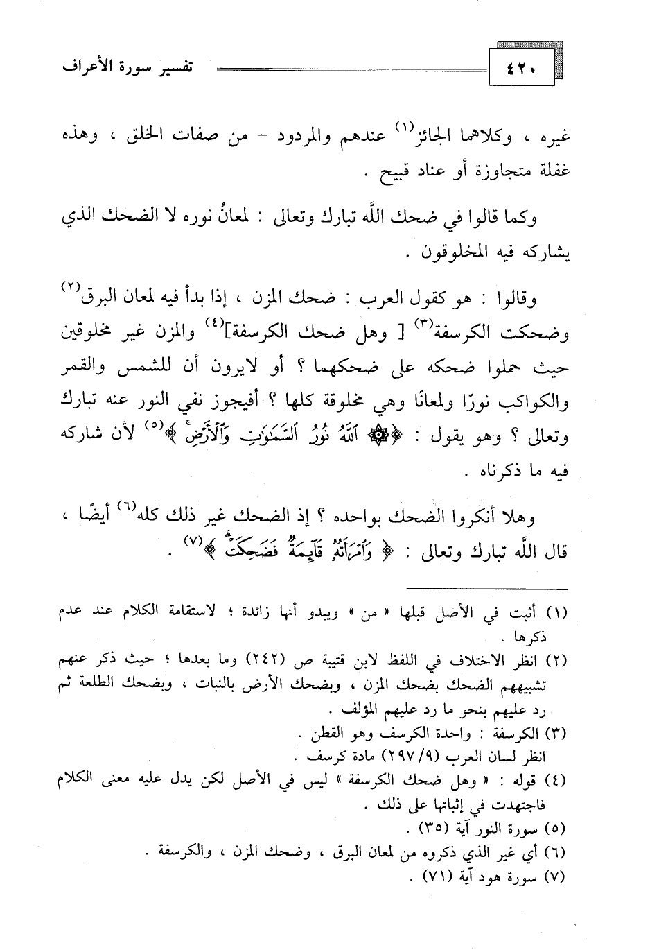 وقالوا: هو كقول العرب: ضحك المزن، إذا بدأ فيه لمعان البرق، وضحكت الكرسفة وهل ضحك الكرسفة، والمزن غير مخلوقين حيث حملوا ضحكه على ضحكهما، أو لا يرون أن للشمس والقمر والكواكب نوراً ولمعاناً وهي مخلوقة كلها، أفيجوز نفي النور عنه تبارك وتعالى، وهو يقول: (اللَّهُ نُورُ السَّمَاوَاتِ وَالْأَرْضِ)