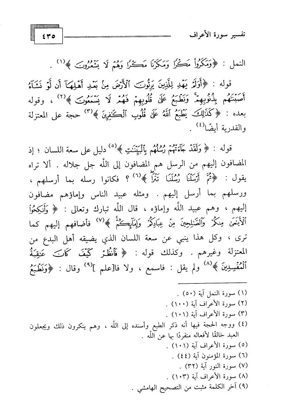 فأضافهم إليهم كما ترى، وكل هذا ينبي عن سعة اللسان الذي يضيقه أهل البدع من المعتزلة وغيرهم. وكذلك قوله: (فَانْظُرْ كَيْفَ كَانَ عَاقِبَةُ الْمُفْسِدِينَ (103) ولم يقل: فاسمع، ولا فاعلم، وقال: (وَنَطْبَعُ عَلَى قُلُوبِهِمْ فَهُمْ لَا يَسْمَعُونَ (100)