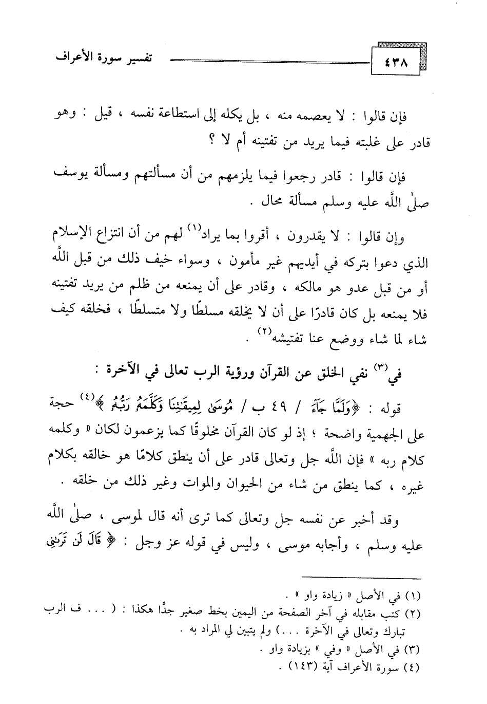 حجة على الجهمية واضحة، إذ لو كان القرآن مخلوقا كما يزعمون لكان " وكلمه كلام ربه " فإن الله جل وتعالى قادر على أن ينطق كلاما هو خالقه بكلام غيره، كما ينطق من شاء من الحيوان والموات وغير ذلك من خلقه. وقد أخبر عن نفسه جل وتعالى كما ترى أنه قال لموسى، صلى الله