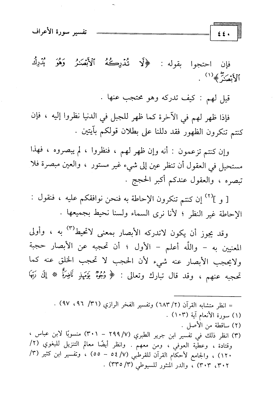 وقد يجوز أن يكون لا تدركه الأبصار بمعنى لا تحيط به، وأولى المعنيين به - والله أعلم - الأول، أن تحجبه عن الأبصار حقبة ولا يحجب الأبصار عنه شيء لأن الحجب لا تحجب الخلق عنه كما تحجبه عنهم، وقد قال تبارك وتعالى: (وُجُوهٌ يَوْمَئِذٍ نَاضِرَةٌ (22) إِلَى رَبِّهَا نَاظِرَةٌ (23)