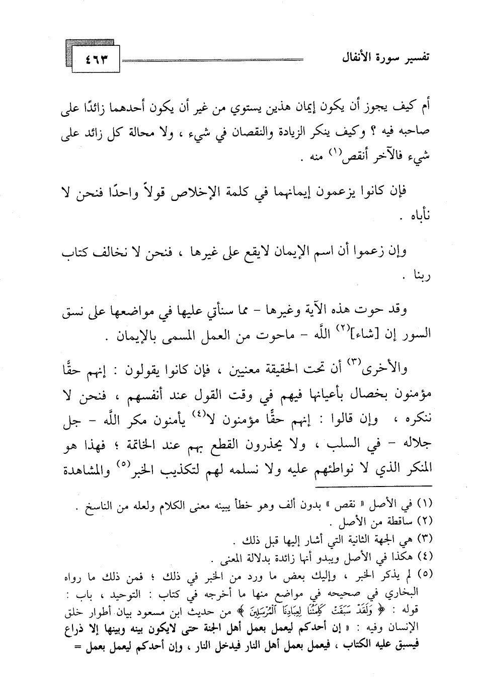 أم كيف يجوز أن يكون إيمان هذين يستوي من غير أن يكون أحدهما زائدا على صاحبه فيه، وكيف ينكر الزيادة والنقصان في شيء، ولا محالة كل زائد على شيء فالآخر أنقص منه.