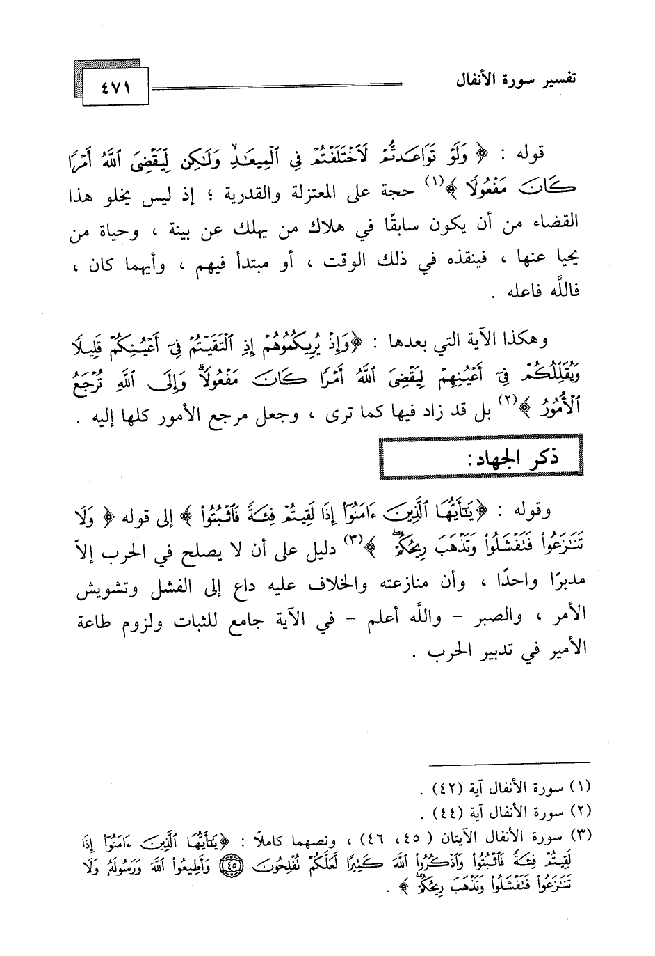 قوله: (وَلَوْ تَوَاعَدْتُمْ لَاخْتَلَفْتُمْ فِي الْمِيعَادِ وَلَكِنْ لِيَقْضِيَ اللَّهُ أَمْرًا كَانَ مَفْعُولًا)