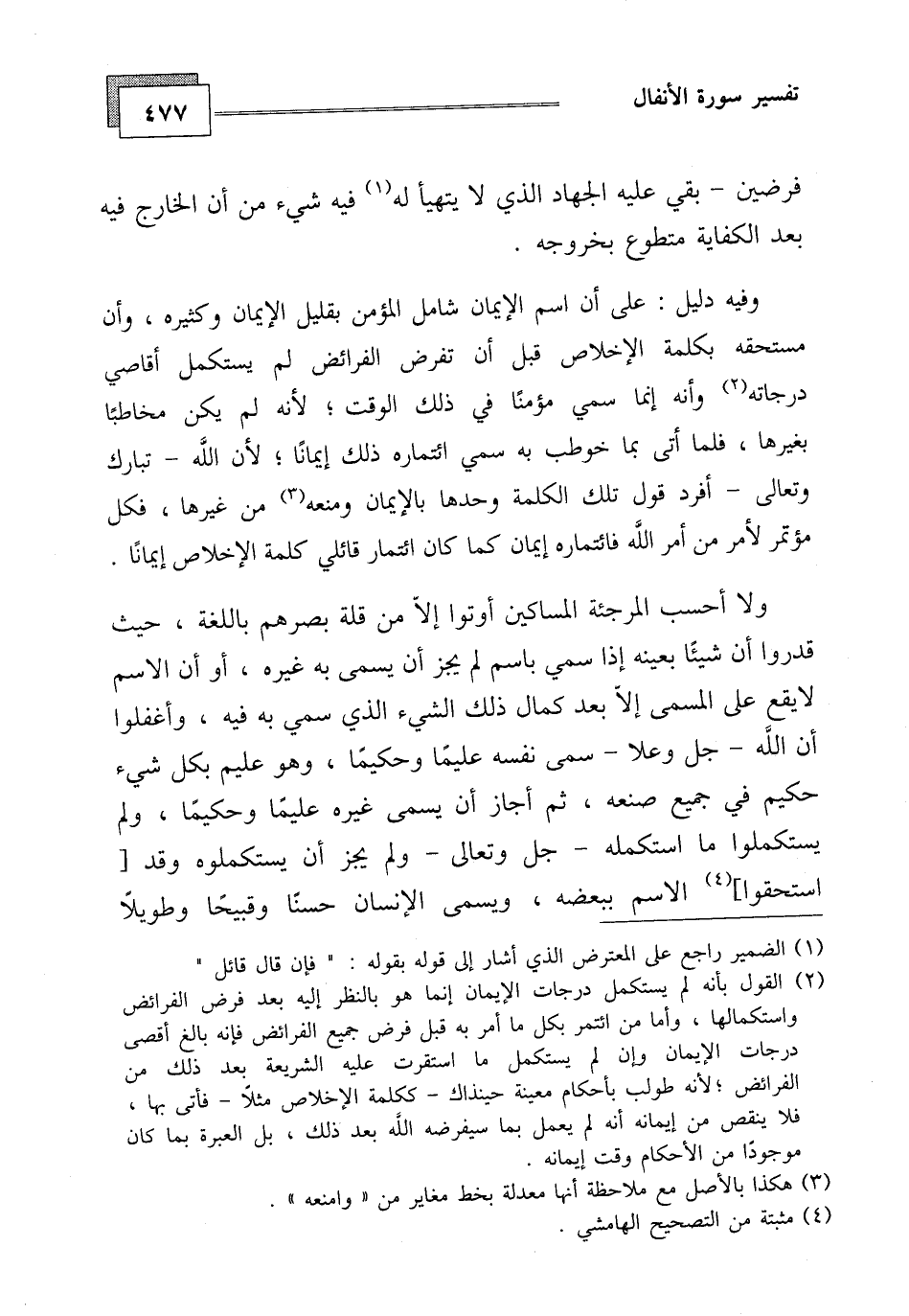 ولا أحسب المرجئة المساكين أوتوا إلا من قلة بصرهم باللغة، حيث قدروا أن شيئا بعينه إذا سمي باسم لم يجز أن يسمى به غيره، أو أن الاسم لا يقع على المسمى إلا بعد كمال ذلك الشيء الذي سمي به فيه، وأغفلوا أن الله - جل وعلا - سمى نفسه عليما وحكيما، وهو عليم بكل شيء حكيم في جميع صنعه، ثم أجاز أن يسمى غيره عليما وحكيما، ولم يستكملوا ما استكمله - جل وتعالى - ولم يجز أن يستكملوه وقد استحقوا الاسم ببعضه، ويسمى الإنسان حسنا وقبيحا وطويلا
