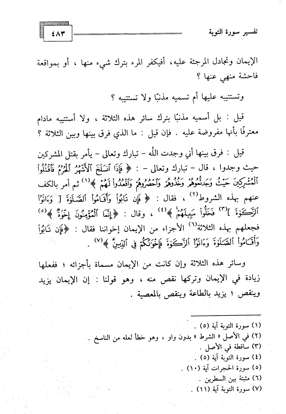 الإيمان وتجادل المرجئة عليه، أفيكفر المرء بترك شيء منها، أو بمواقعة فاحشة منهي عنها، وتستتيبه عليها أم تسميه مذنبا ولا تستتيبه.