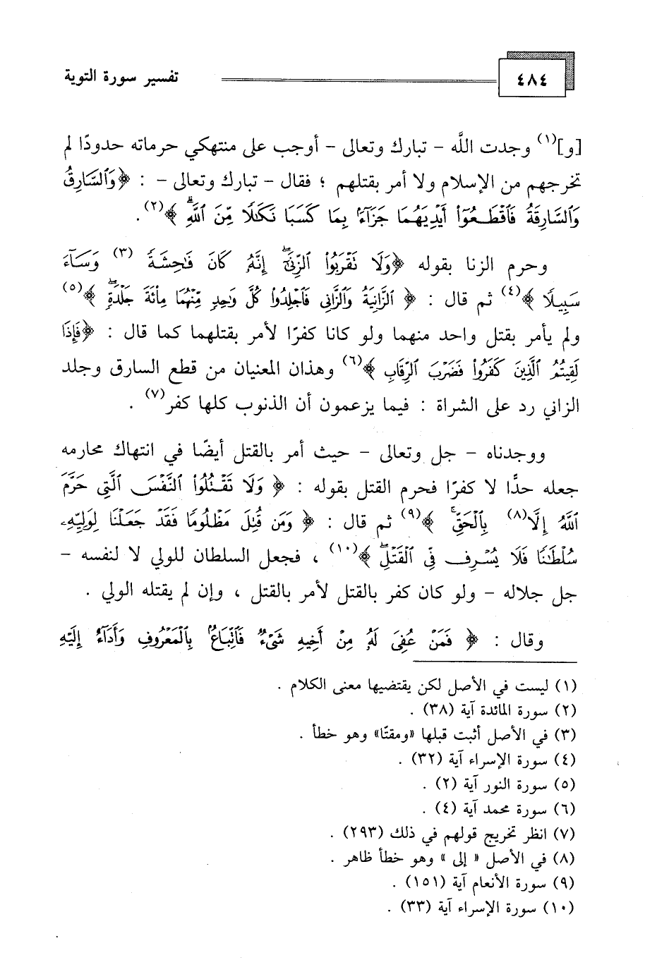 وهذان المعنيان من قطع السارق وجلد الزاني رد على الشراة: فيما يزعمون أن الذنوب كلها كفر (7) . ووجدناه - جل وتعالى - حيث أمر بالقتل أيضا في انتهاك محارمه جعله حدا لا كفرا فحرم القتل بقوله: وَلَا تَقْتُلُوا النَّفْسَ الَّتِي حَرَّمَ اللَّهُ إِلَّا بِالْحَقِّ) ثم قال: (وَمَنْ قُتِلَ مَظْلُومًا فَقَدْ جَعَلْنَا لِوَلِيِّهِ سُلْطَانًا فَلَا يُسْرِفْ فِي الْقَتْلِ) ، فجعل السلطان للولي لا لنفسه - جل جلاله - ولو كان كفر بالقتل لأمر بالقتل، وإن لم يقتله الولي.