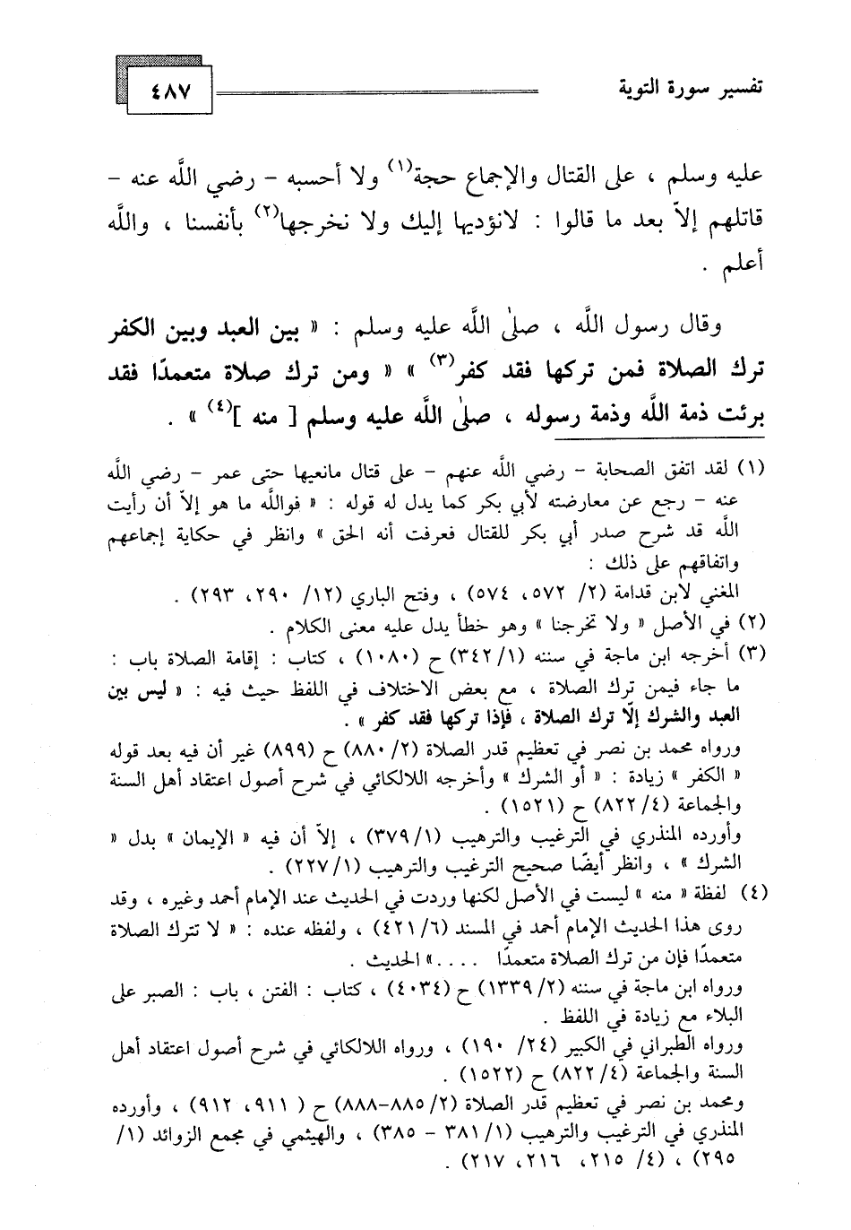 وقال رسول الله، صلى الله عليه وسلم: " بين العبد وبين الكفر ترك الصلاة فمن تركها فقد كفر " ومن ترك صلاة متعمدا فقد برئت ذمة الله وذمة رسوله، صلى الله عليه وسلم منه ".