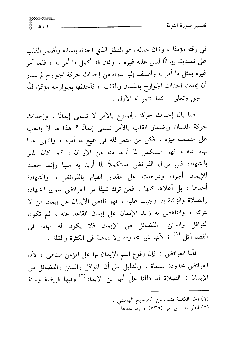 فما بال إحداث حركة الجوارح بالأمر لا تسمى إيمانا، وإحداث حركة اللسان وإضمار القلب بالأمر تسمى إيمانا، هذا ما لا يذهب على منصف ميزه، فكل من ائتمر حقه في جميع ما أمره، وانتهى عما نهاه عنه، فهو مستكمل لما أريد منه من الإيمان، كما كان المقر بالشهادة قبل نزول الفرائض مستكملا لما أريد به منها وإنما جعلنا للإيمان أجزاء ودرجات على مقدار القيام بالفرائض، والشهادة أحدها، بل أعلاها كلها، فمن ترك شيئا من الفرائض سوى الشهادة والصلاة والزكاة إذا وجبت عليه، فهو ناقص الإيمان عن إيمان من لا يتركه، والناهض به زائد الإيمان على إيمان القاعد عنه، ثم تكون النوافل والسنن والفضائل من الإيمان فلا يكون له نهاية في الفضائل،، لأنها غير محدودة ولا متناهية في الكثرة والقلة.