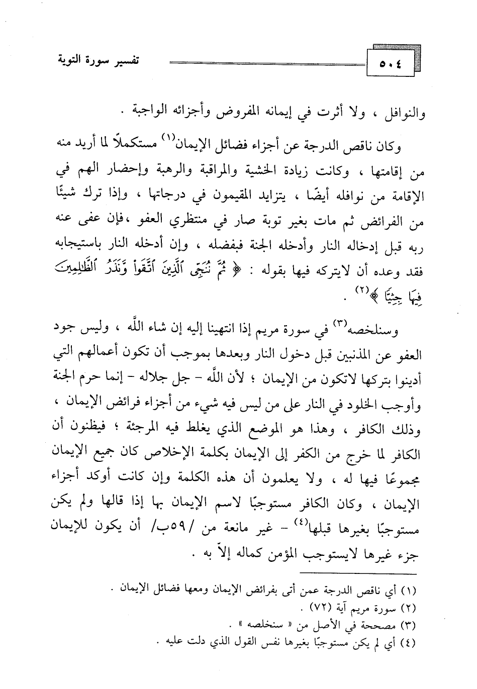 وسنلخصه في سورة مريم إذا انتهينا إليه إن شاء الله، وليس جود العفو عن المذنبين قبل دخول النار وبعدها بموجب أن تكون أعمالهم التي أدينوا بتركها لا تكون من الإيمان، لأن الله - جل جلاله - إنما حرم الجنة وأوجب الخلود في النار على من ليس فيه شيء من أجزاء فرائض الإيمان، وذلك الكافر، وهذا هو الموضع الذي يغلط فيه المرجئة، فيظنون أن الكافر لما خرج من الكفر إلى الإيمان بكلمة الإخلاص كان جميع الإيمان مجموعا فيها له، ولا يعلمون أن هذه الكلمة وإن كانت أوكد أجزاء الإيمان، وكان الكافر مستوجبا لاسم الإيمان بها إذا قالها ولم يكن مستوجبا بغيرها قبلها - غير مانعة من أن يكون للإيمان جزء غيرها لا يستوجب المؤمن كماله إلا به.