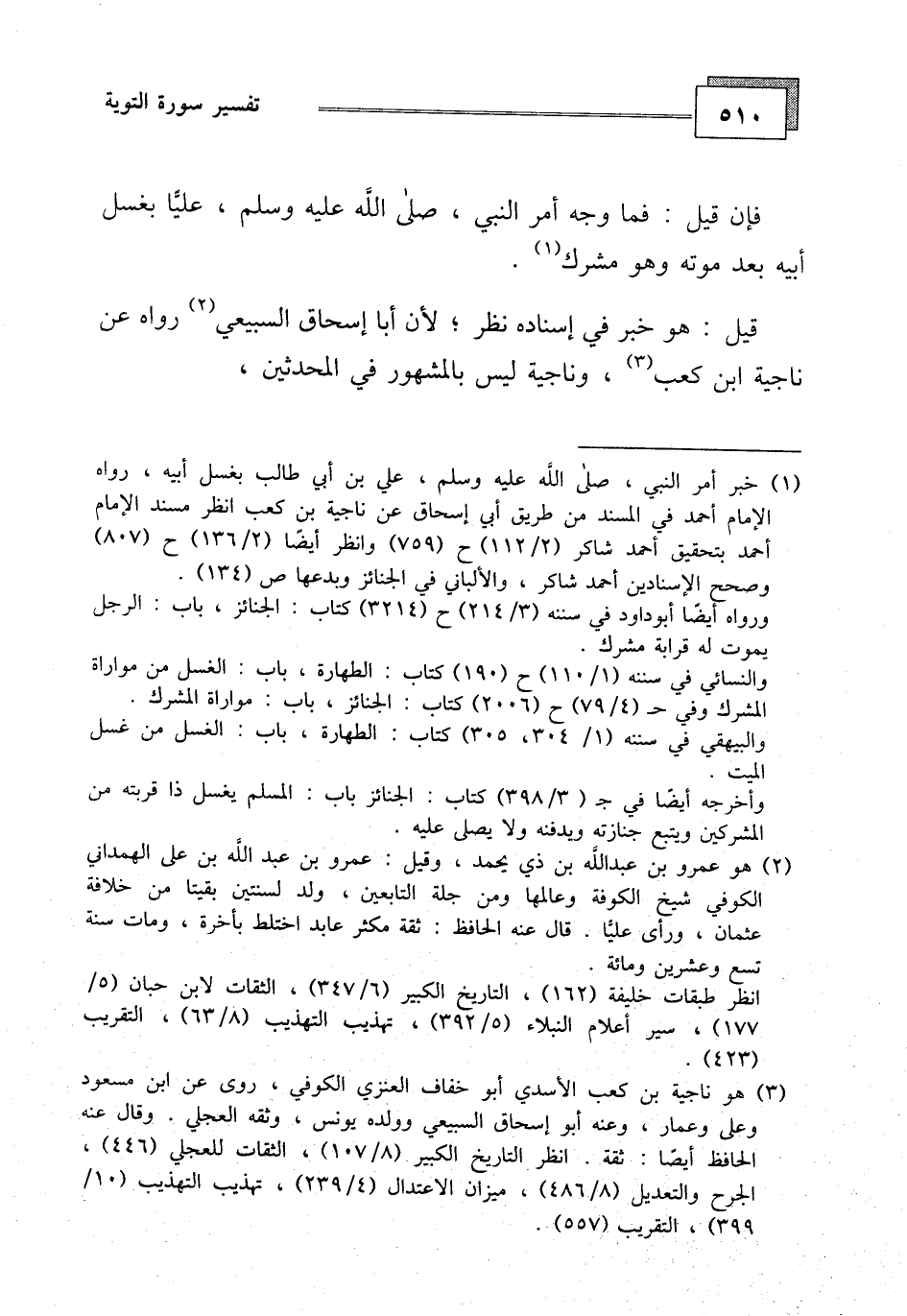 (1) خبر أمر النبي، صلى الله عليه وسلم، علي بن أبي طالب بغسل أبيه، رواه الإمام أحمد في المسند من طريق أبي إسحاق عن ناجية بن كعب انظر مسند الإمام أحمد بتحقيق أحمد شاكر (2/2 1 1) ح (759) وانظر أيضا (136/2) ح (807) وصحح الإسنادين أحمد شاكر، والألباني في الجنائز وبدعها ص (134) .