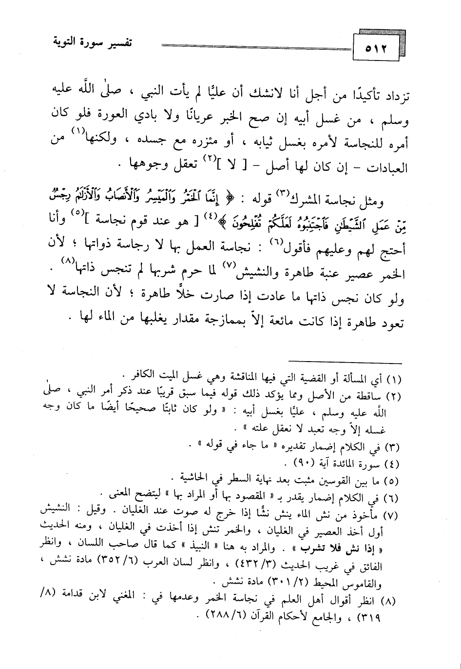 ومثل نجاسة المشرك قوله، (إِنَّمَا الْخَمْرُ وَالْمَيْسِرُ وَالْأَنْصَابُ وَالْأَزْلَامُ رِجْسٌ مِنْ عَمَلِ الشَّيْطَانِ فَاجْتَنِبُوهُ لَعَلَّكُمْ تُفْلِحُونَ (90)